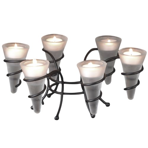 - Frame made of metal; includes 6 frosted glass vase votive holders; candles not included