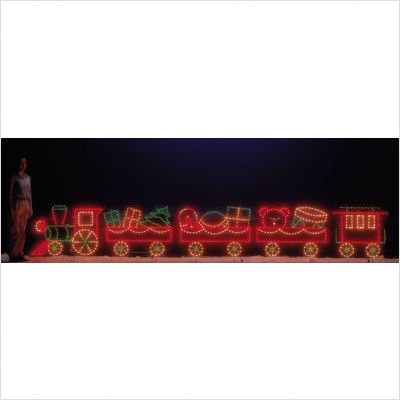 650, 6502, 6501 This scene makes a wonderful addition to any holiday lighting collection. Carrying gifts and a tree, this train is sure to bring Christmas joy to you and your loved ones. The durable metal frame is outlined with red, white and green lights to create an unforgettable Christmas locomotive. Also available is the Guy Wire Stability Kit, which protects this item from strong winds and elements, as well as Roof and Floor Bases for mounting purposes. Features: - Solid steel frame - Powder coated frame for long lasting protection - Strong welding to ensure durability - Additional replacement bulbs - Display comes folded up with lights already attached - Illustrated installation and product care instructions - Limited 5-Year Manufacturer's Warranty - Lights rated for: 3,000 hours of use Item Dimension Amps Bulbs 3 Car Train Set 2.6' H x 10.5' W 2.2 550 Candy Cane Car 2.6' H x 4.1' W 0.8 200 Drum Car 2.6' H x 4.1' W 0.8 200 Guy Wire Kit Everything you need to secure your outdoor display. Always use guy wires to hold displays firm against the elements. Roof Base - 42'' This item allows you to mount selected displays on peaked roofs. The perfect way to display your holiday light for everyone to see. Floor Stand - 25'' This item allows you to mount selected displays on hard flat surfaces. Perfect for larger items or driveway displays. Recommended for most holiday lights. Security Stake Lock your holiday lighting display for increased security. Designed to be embedded just below ground level.