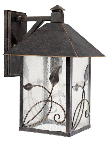 As part of the French Garden Collection, this outdoor wall light has stems and leaves gently scrolling upward. Features a warm French bronze finish and clear seedy glass. From Franklin Iron Works®. Takes one 60 watt bulb (not included). 15" high. 10" wide. Extends 11 1/2" from the wall. Backplate is 9" high, 4 3/4" wide. Mounting point to top of fixture is 4".