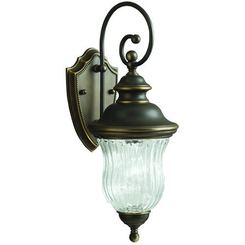 The distinctive antique style of this attractive outdoor wall light comes courtesy of its delicate scroll detail, solid brass construction and a rich bronze finish. A subtle hourglass shape to the clear ribbed-glass shade complements the design and voids the darkness. Uses a single 100-watt bulb (not included). This fixture is approved for wet location use as defined by the National Electric Code. Please consult your local electrical code for details. DL # 1618.