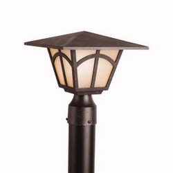 Kichler's diminutive Glendale 10.5 Inch Outdoor Post Lantern is topped arching mission lines under a bronze roof. Fabulous decor for exterior locations, the golden mist glass exhales a gorgeous light. 10"W x 10.5"H. Post not included. Aged Bronze finish and Etched Umber Glass. UL listed for wet locations. Takes one 100W incandescent bulb - not included. Compatible with one hybrid 18-25W CFL bulb.