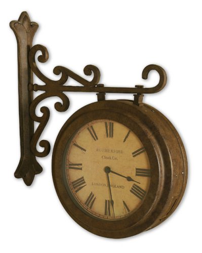 06710 This clock features hand forged metal frame and bracket in a lightly distressed, rust brown finish with aged beige face. This clock features a dial on both sides. Quartz movements. Features: -Maitland double faced hanging wall clock -Designed by Grace Feyock -Lightly distressed, rust brown finish with aged beige face -Quartz movements -Includes hand forged metal bracket -Overall dimensions: 22'' H x 17'' W x 6'' H Specifications