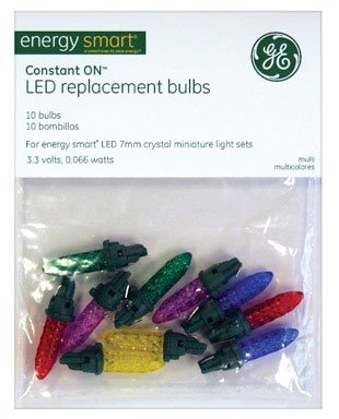 "GE" LED CRYSTAL MINIATURE REPLACEMENT BULBS * 10 pack. * Multi color. * Replacement bulbs for GE crystal mini light sets. * Peggable poly bag and header Basic Trim-A-Tree item - stocked in RSC.