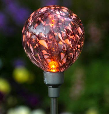 A beautiful way to give your garden ambient light while conserving energy! The "Firefly" solar garden light uses energy from the sun to bring a warm glow to your garden at night. By day, the "Firefly" serves as a decorative garden accent while still working to store up energy for the evening. The hand-blown cracked glass ball gives it a classic amber 'refracted' glow to accent the landscape. The stainless steel stake won't rust and will blend with its surroundings. You can even shorten the stake for low-profile use in a flower bed or pot. It's virtually maintenance free! Includes stainless steel stake, solar panel, AA rechargeable batteries. Choose from a Blue, Green, Sea Anemone or Fuchsia Finial. Assembly level/degree of difficulty: Easy.